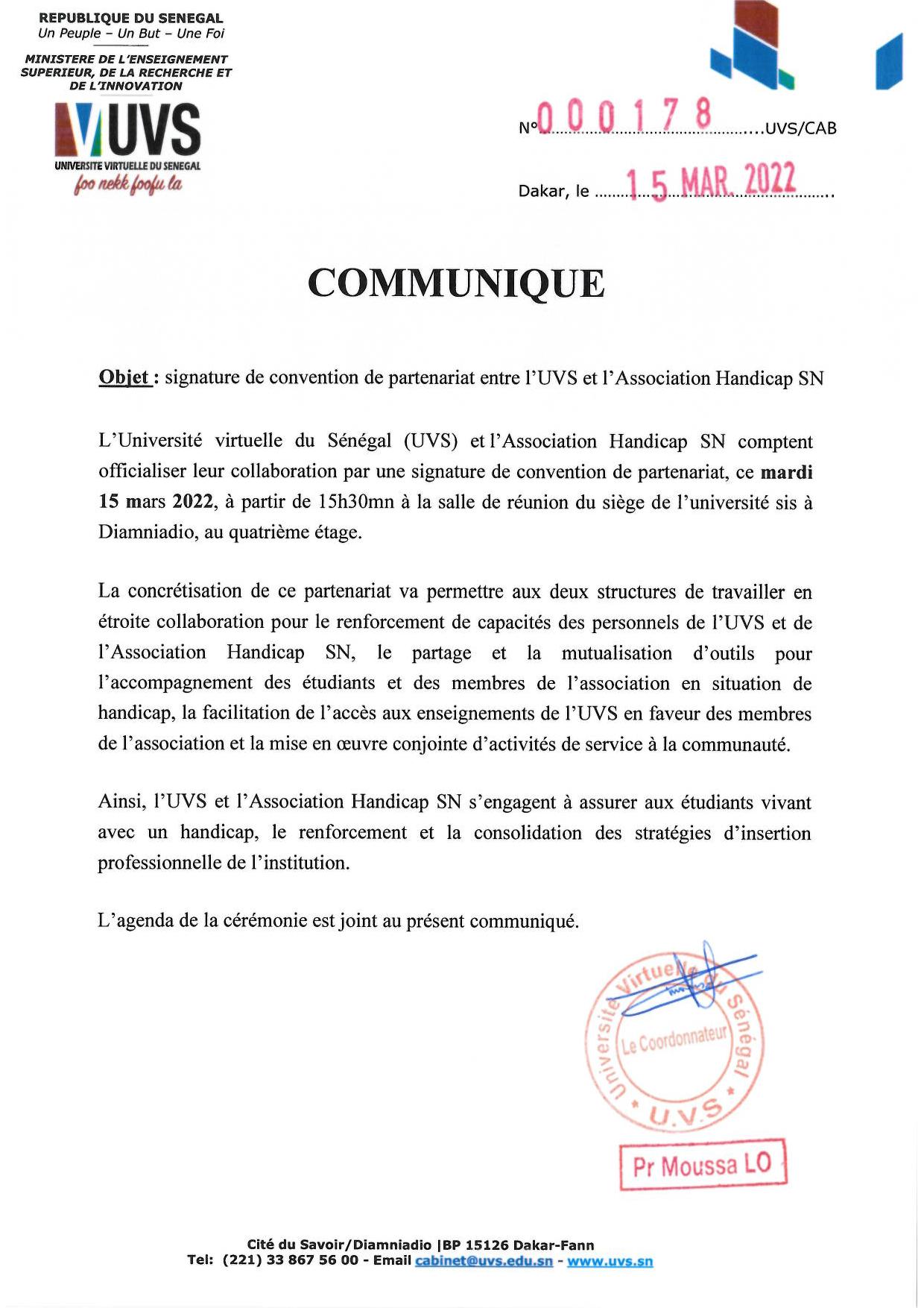 Accueil > communiqué > Cérémonie de signature de convention UVS – Handicap SN