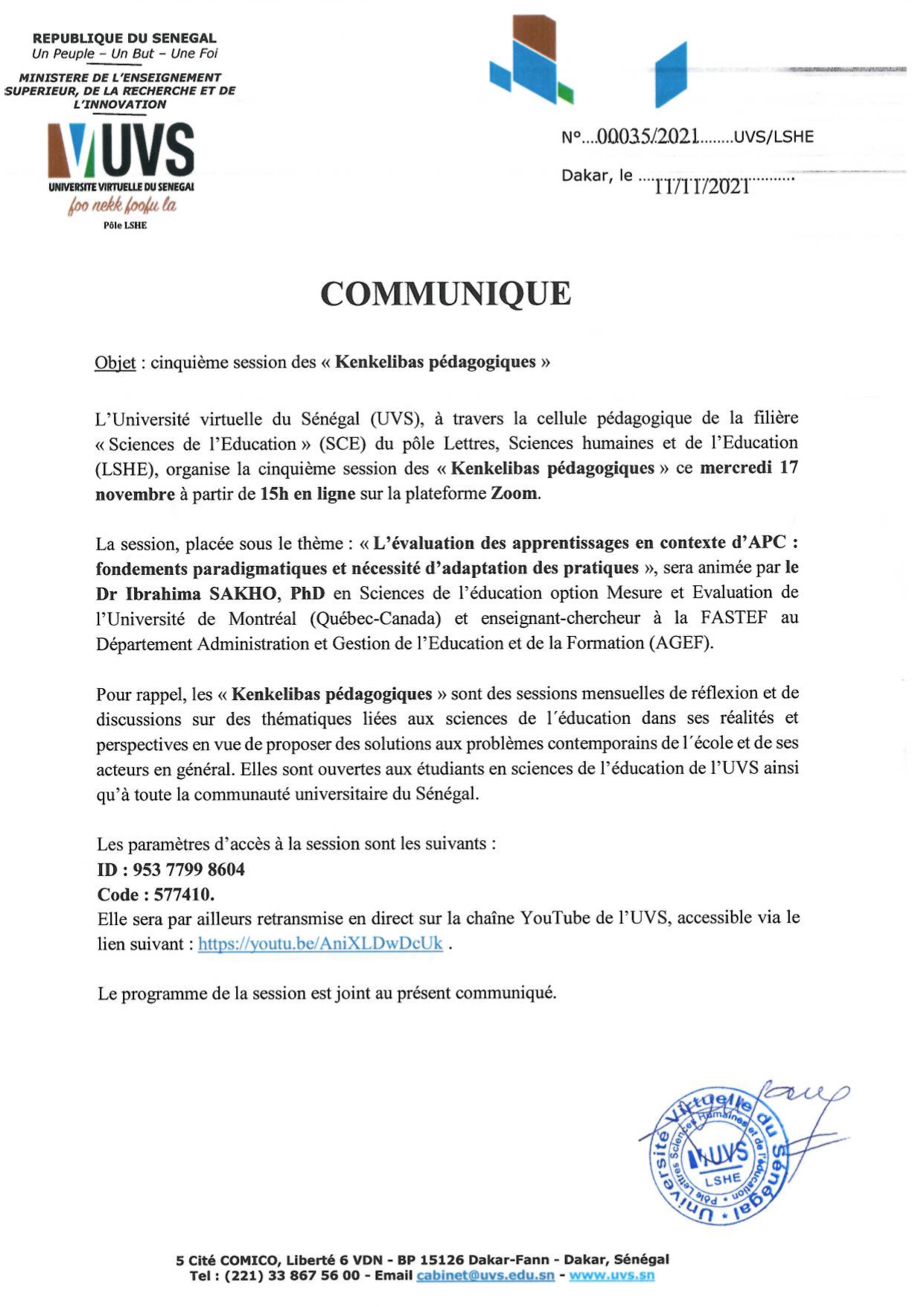 Recteur, UN-CHK Professeur titulaire en Informatique, Moussa LO est depuis novembre 2016 le Recteur de l’Université numérique Cheikh Hamidou KANE (ex- Université virtuelle du Sénégal) (www.uvs.sn). Il a, auparavant, occupé plusieurs fonctions de responsabilité à l’Université Gaston Berger de Saint-Louis (www.ugb.sn) : Vice-président de l’Assemblée de l’Université, Directeur de l’UFR de Sciences Appliquées et de Technologie. Entre 2014 et 2016, il a dirigé le Centre d’Excellence Africain en Mathématiques, Informatique et TIC (www.ceamitic.sn). De 2015 à 2018, il a codirigé le Laboratoire International de Recherche en Informatique et en Mathématiques Appliquées (lirima.inria.fr). Il a dirigé plusieurs thèses de doctorat d’informatique et est auteur de plusieurs publications scientifiques, principalement dans les domaines du web, du web sémantique et de l’ingénierie de la connaissance. Le Professeur LO est également membre fondateur et premier Président (2013-2015) de l’Association Sénégalaise des Chercheurs en Informatique (ASCII, ascii.org.sn/) Il est depuis 2021, membre titulaire de l’Académie Nationale des Sciences et Techniques du Sénégal (ansts.assistic.net) et Président du Conseil scientifique et académique du Campus franco-sénégalais (cfs.edu.sn). Il est Chevalier dans l’ordre international des Palmes académiques du CAMES (www.lecames.org/programmes/oipa ).Pr Moussa LO,