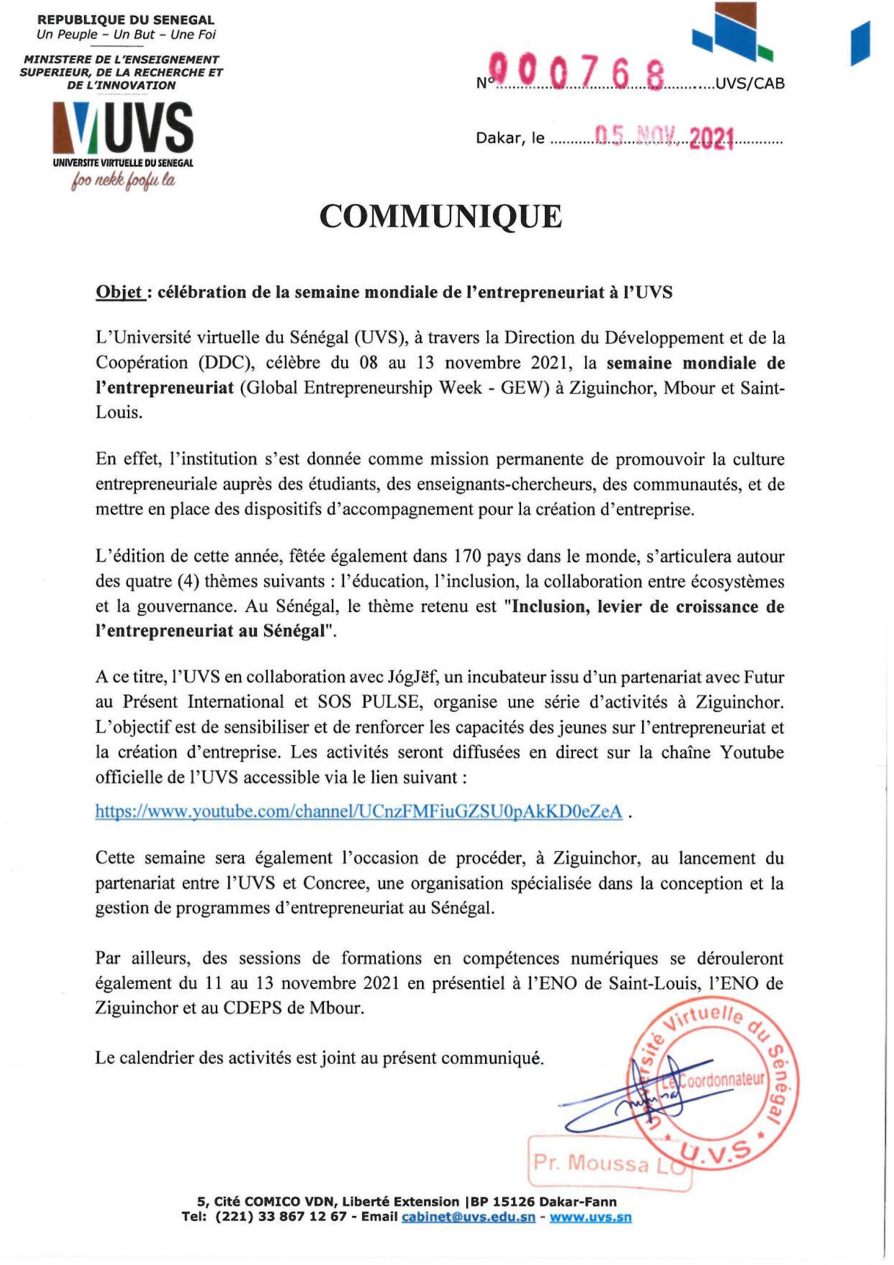 Accueil > communiqué > Communiqué – célébration de la semaine mondiale de l’entrepreneuriat à l’UVS