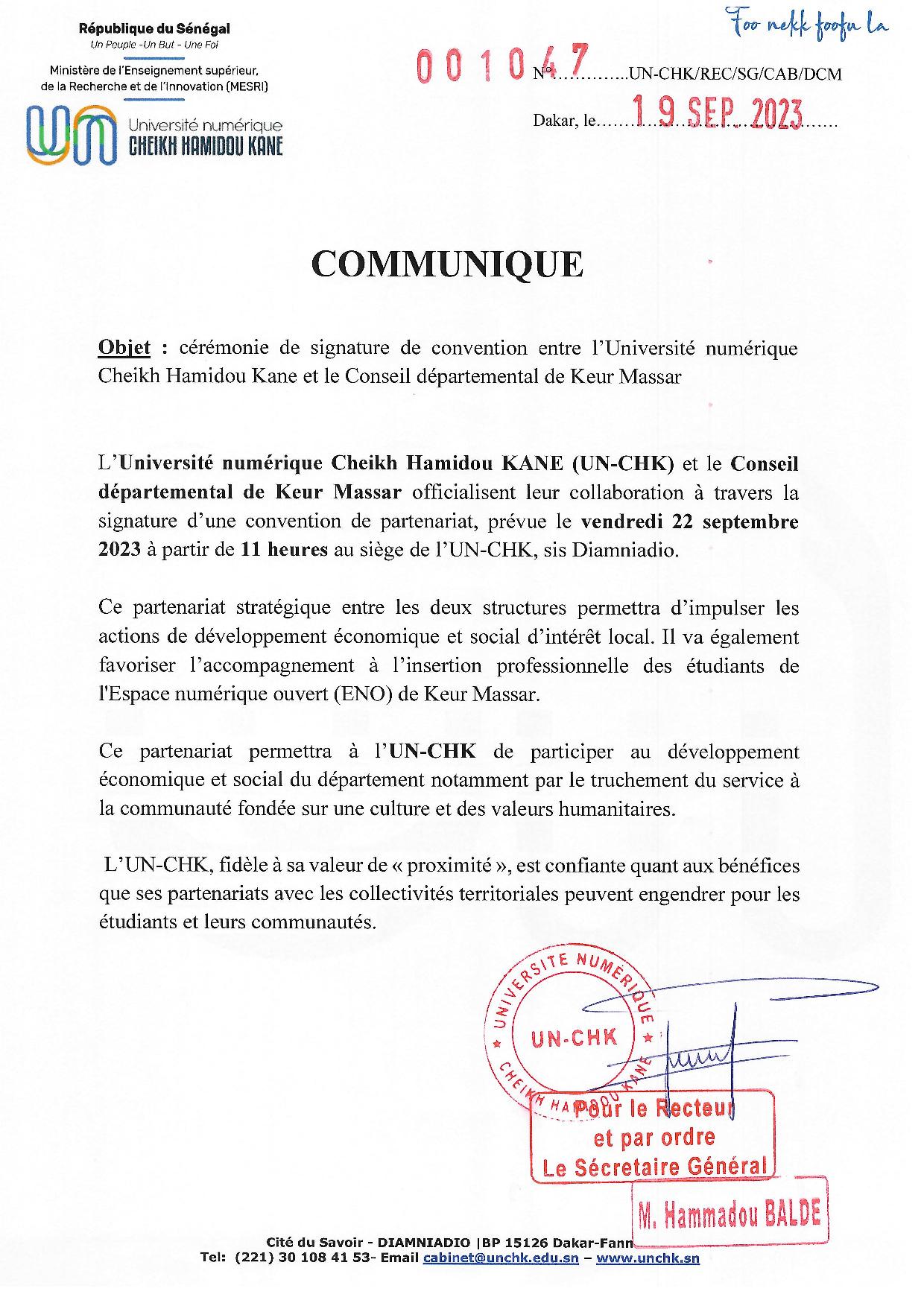 Accueil > communiqué > Communiqué – cérémonie de signature de convention entre l’UN-CHK et Le Conseil départemental de Keur Massar