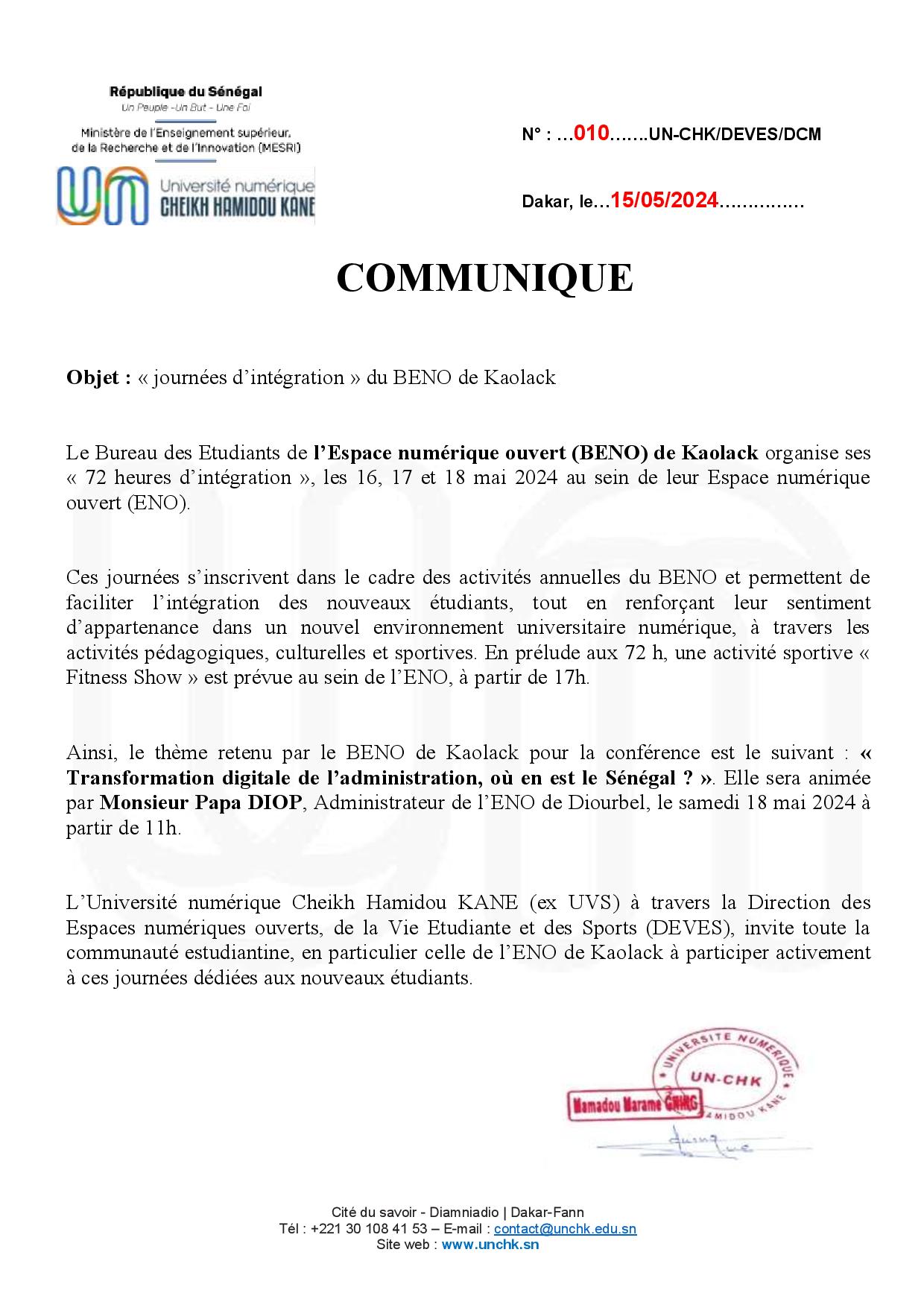 Communiqué journées d’intégration du BENO de Kaolack