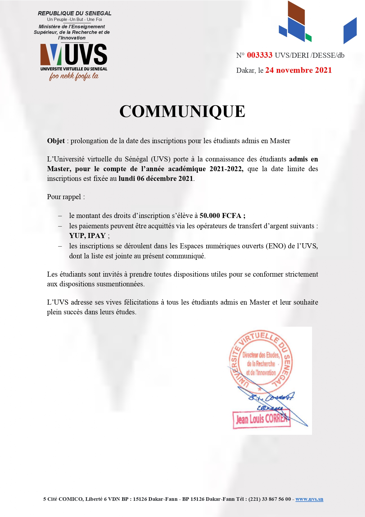 Accueil > communiqué > Communiqué – prolongation de la date des inscriptions pour les étudiants admis en Master