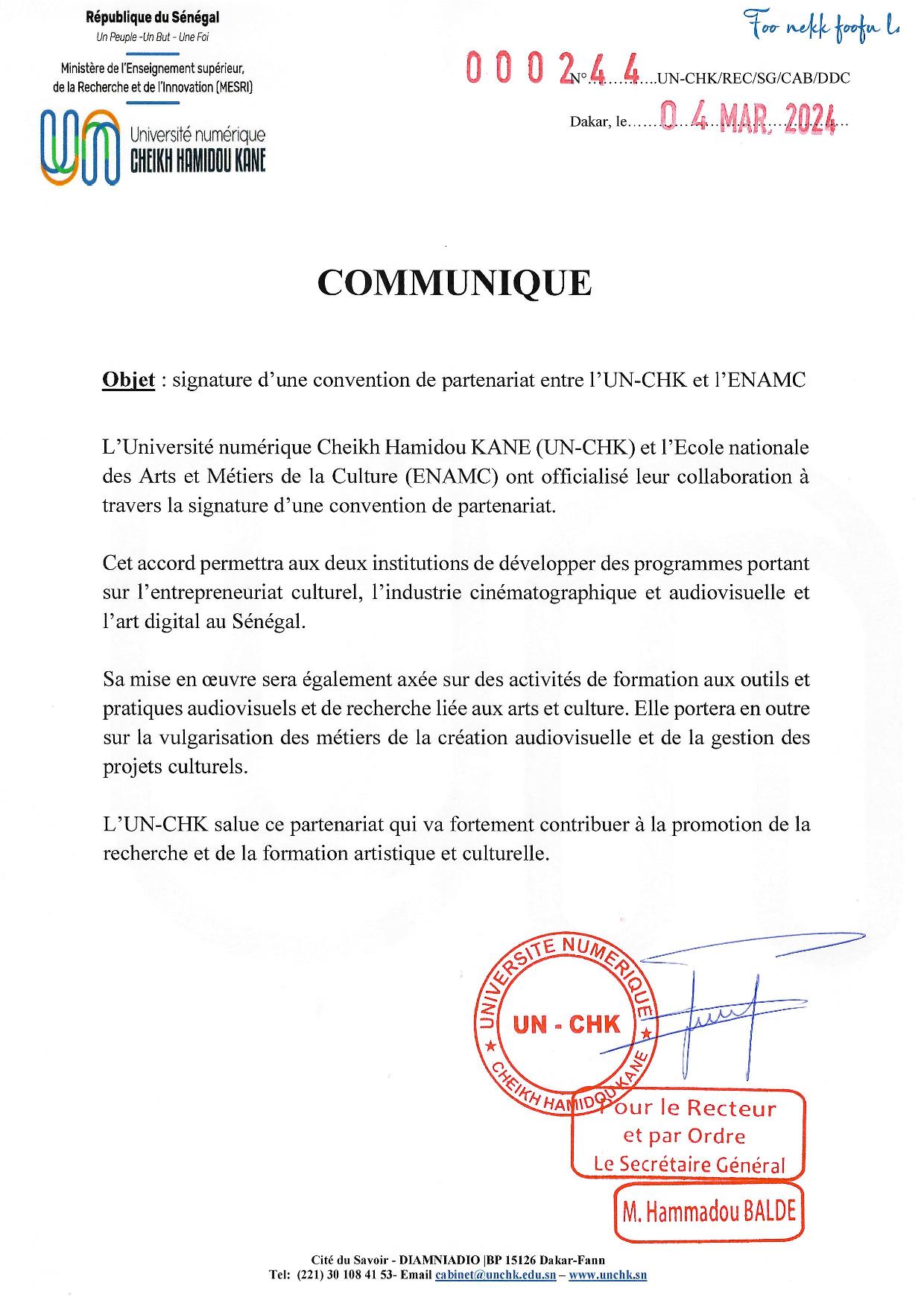 Accueil > communiqué > Communiqué signature de convention UN-CHK et ENAMC