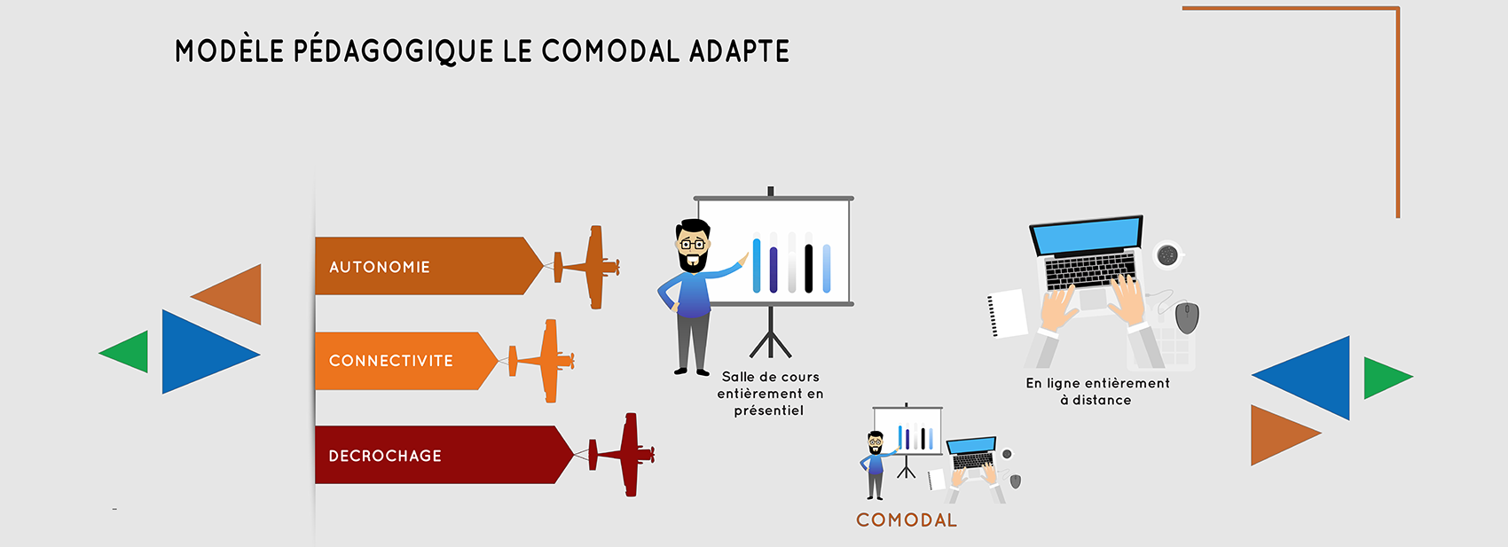 Le comodal (classique) est un système de formation où coexistent de façon simultanée les modes de formation en présentiel et à distance, ce qui permet à l’étudiant de choisir le mode de diffusion qui lui convient le mieux, en fonction donc de ses besoins, contraintes ou préférences. S’inspirant des avantages de ce comodal, l’UN-CHK a donc mis au point « le comodal adapté ».
