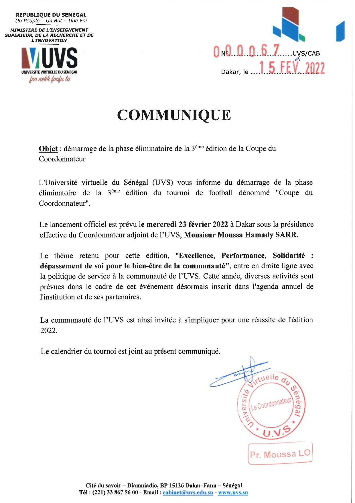 Recteur, UN-CHK Professeur titulaire en Informatique, Moussa LO est depuis novembre 2016 le Recteur de l’Université numérique Cheikh Hamidou KANE (ex- Université virtuelle du Sénégal) (www.uvs.sn). Il a, auparavant, occupé plusieurs fonctions de responsabilité à l’Université Gaston Berger de Saint-Louis (www.ugb.sn) : Vice-président de l’Assemblée de l’Université, Directeur de l’UFR de Sciences Appliquées et de Technologie. Entre 2014 et 2016, il a dirigé le Centre d’Excellence Africain en Mathématiques, Informatique et TIC (www.ceamitic.sn). De 2015 à 2018, il a codirigé le Laboratoire International de Recherche en Informatique et en Mathématiques Appliquées (lirima.inria.fr). Il a dirigé plusieurs thèses de doctorat d’informatique et est auteur de plusieurs publications scientifiques, principalement dans les domaines du web, du web sémantique et de l’ingénierie de la connaissance. Le Professeur LO est également membre fondateur et premier Président (2013-2015) de l’Association Sénégalaise des Chercheurs en Informatique (ASCII, ascii.org.sn/) Il est depuis 2021, membre titulaire de l’Académie Nationale des Sciences et Techniques du Sénégal (ansts.assistic.net) et Président du Conseil scientifique et académique du Campus franco-sénégalais (cfs.edu.sn). Il est Chevalier dans l’ordre international des Palmes académiques du CAMES (www.lecames.org/programmes/oipa ).Pr Moussa LO,