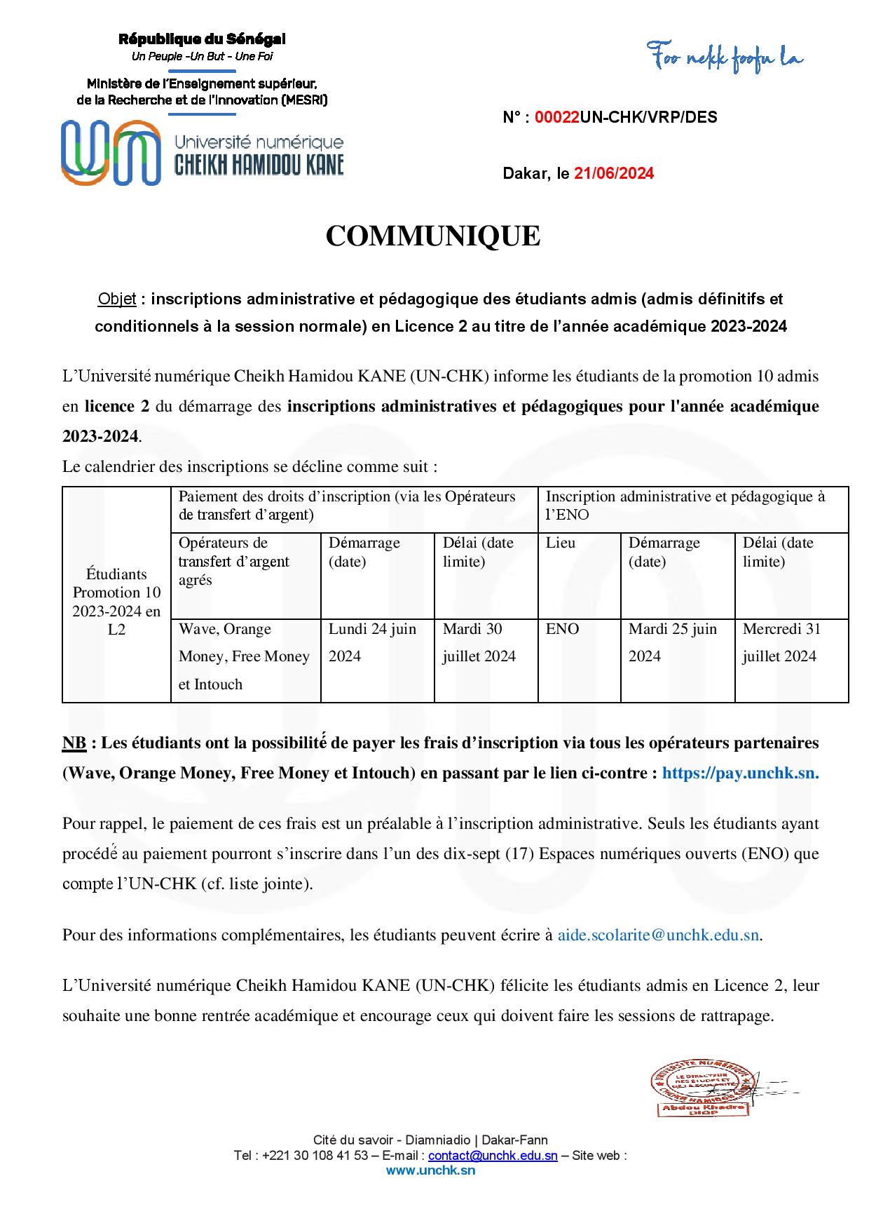 inscriptions administrative et pédagogique des étudiants admis (admis définitifs et conditionnels à la session normale) en Licence 2 au titre de l’année académique 2023-2024