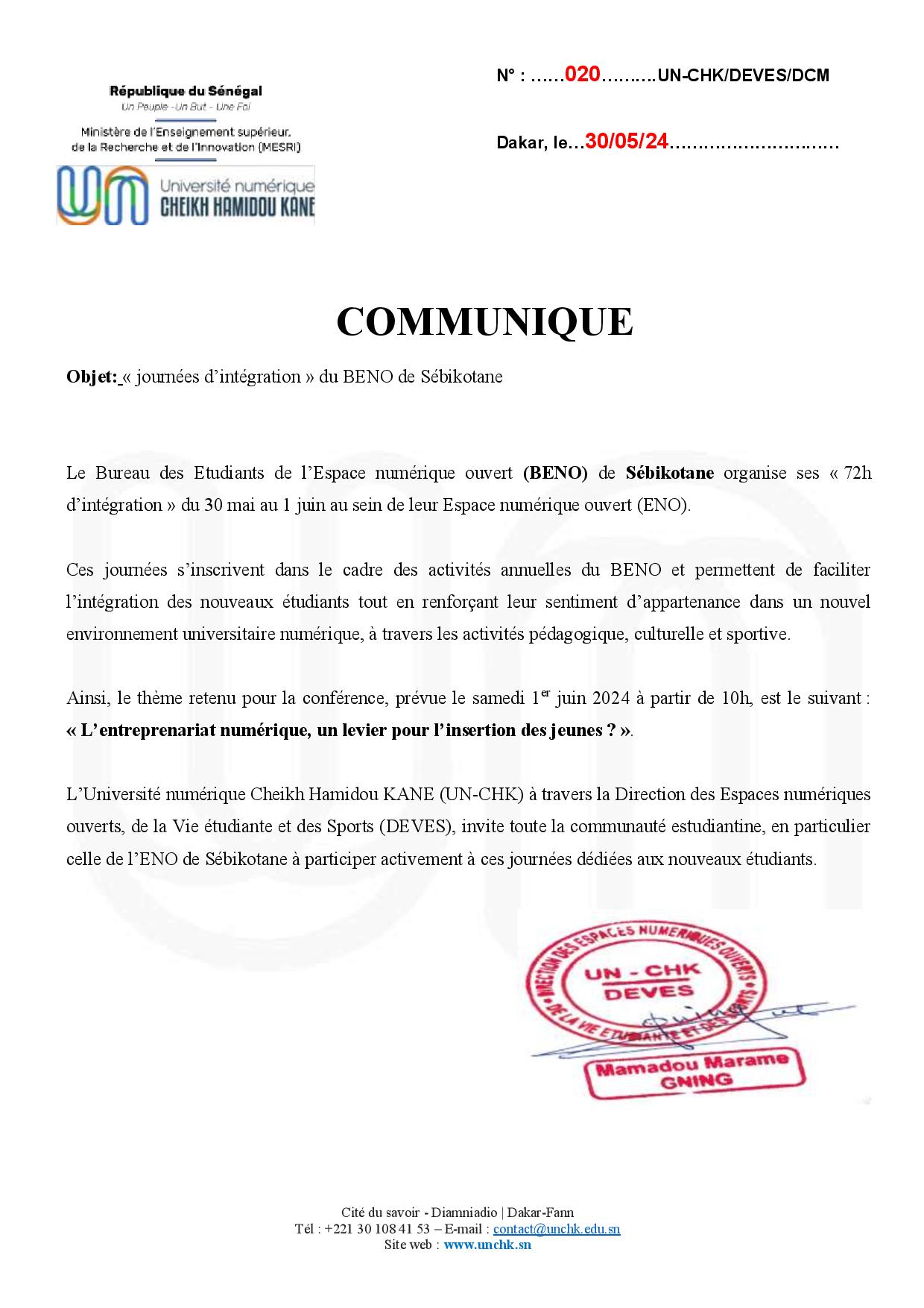 Accueil > communiqué > « journées d’intégration » du BENO de Sébikotane