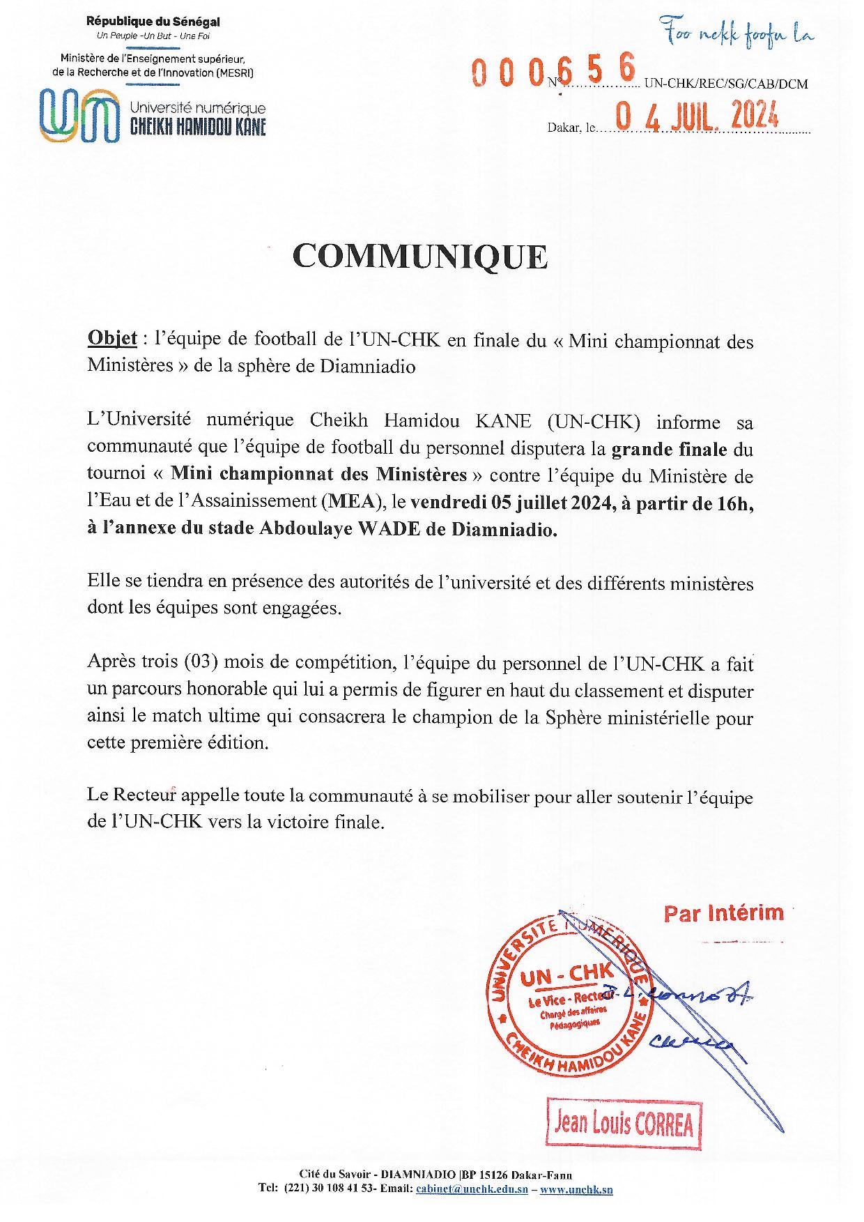 Accueil > communiqué > l’équipe de football de l’UN-CHK en finale du « Mini championnat des Ministères » de la sphère de Diamniadio