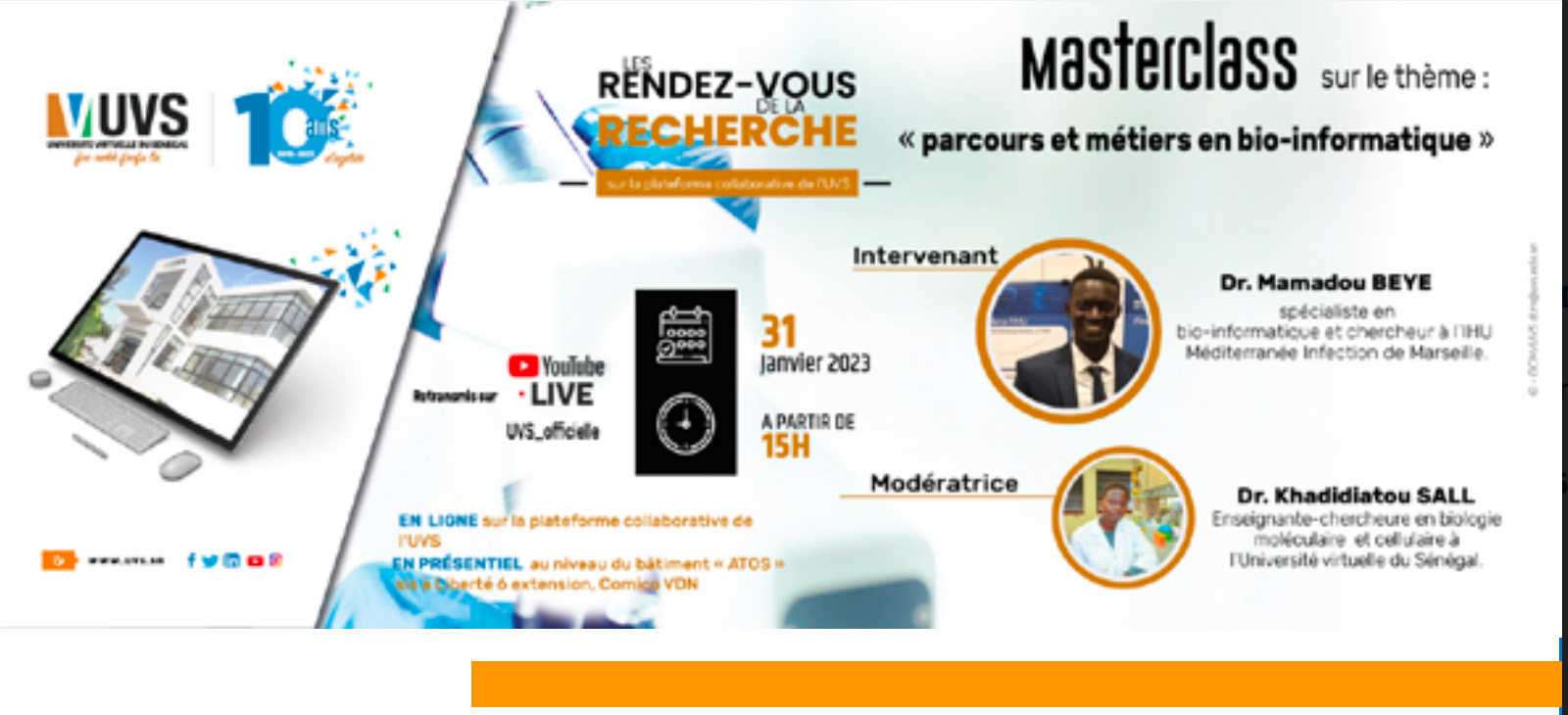 Pour lancer l’année 2023 des « Rendez-vous de la Recherche », le Pôle d’Innovation et d’Expertise pour le Développement (PIED) a tenu pour le mois de janvier, une conférence sur le thème « Parcours et métiers en microbiologie » avec le Dr. El Hadji SECK le 16 janvier, et une masterclass sur les « Parcours et métiers en bio-informatique », le 31 janvier en mode hybride (en présentiel et en ligne), animée par Dr. Mamadou BEYE.