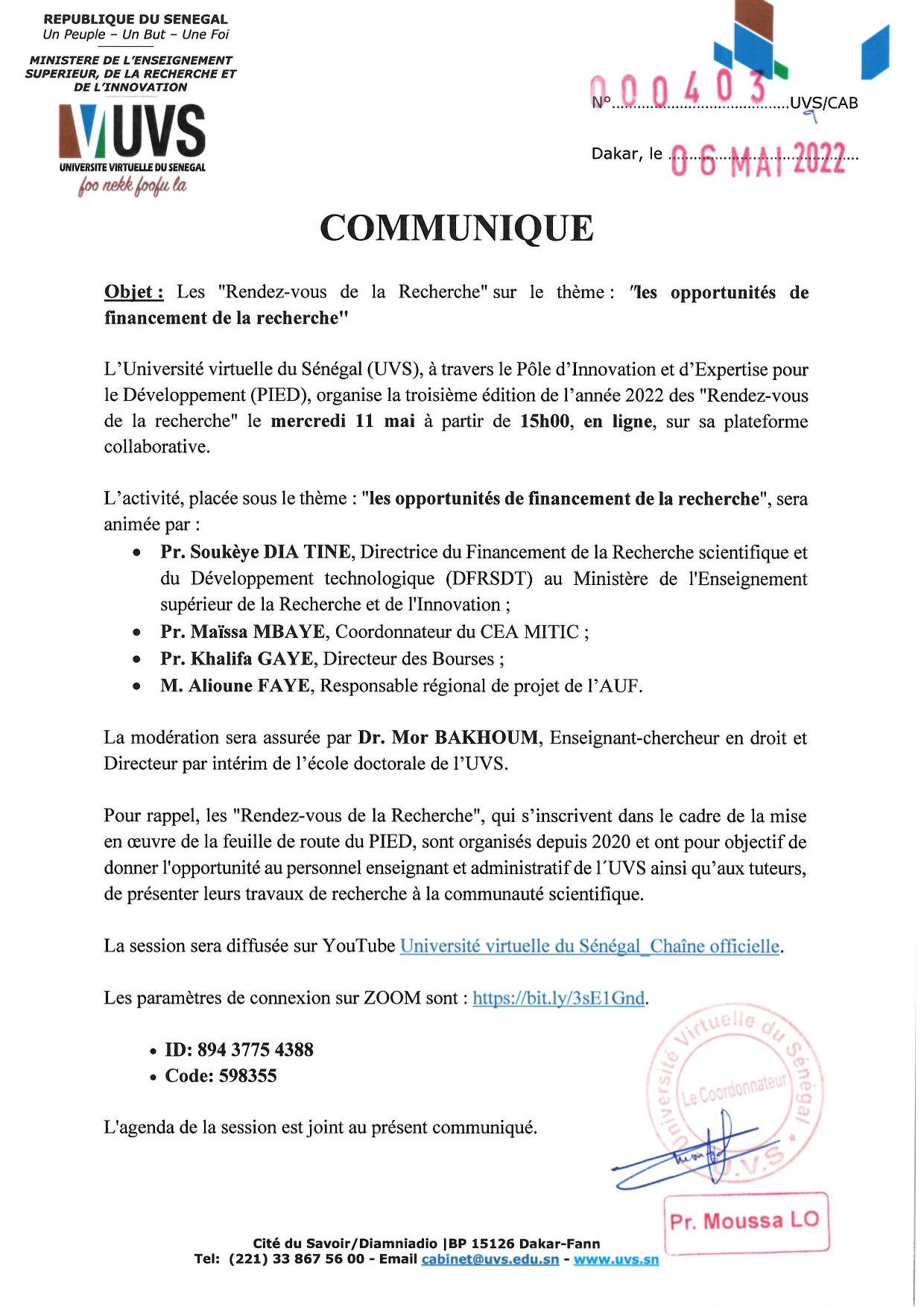 Recteur, UN-CHK Professeur titulaire en Informatique, Moussa LO est depuis novembre 2016 le Recteur de l’Université numérique Cheikh Hamidou KANE (ex- Université virtuelle du Sénégal) (www.uvs.sn). Il a, auparavant, occupé plusieurs fonctions de responsabilité à l’Université Gaston Berger de Saint-Louis (www.ugb.sn) : Vice-président de l’Assemblée de l’Université, Directeur de l’UFR de Sciences Appliquées et de Technologie. Entre 2014 et 2016, il a dirigé le Centre d’Excellence Africain en Mathématiques, Informatique et TIC (www.ceamitic.sn). De 2015 à 2018, il a codirigé le Laboratoire International de Recherche en Informatique et en Mathématiques Appliquées (lirima.inria.fr). Il a dirigé plusieurs thèses de doctorat d’informatique et est auteur de plusieurs publications scientifiques, principalement dans les domaines du web, du web sémantique et de l’ingénierie de la connaissance. Le Professeur LO est également membre fondateur et premier Président (2013-2015) de l’Association Sénégalaise des Chercheurs en Informatique (ASCII, ascii.org.sn/) Il est depuis 2021, membre titulaire de l’Académie Nationale des Sciences et Techniques du Sénégal (ansts.assistic.net) et Président du Conseil scientifique et académique du Campus franco-sénégalais (cfs.edu.sn). Il est Chevalier dans l’ordre international des Palmes académiques du CAMES (www.lecames.org/programmes/oipa ).Pr Moussa LO,