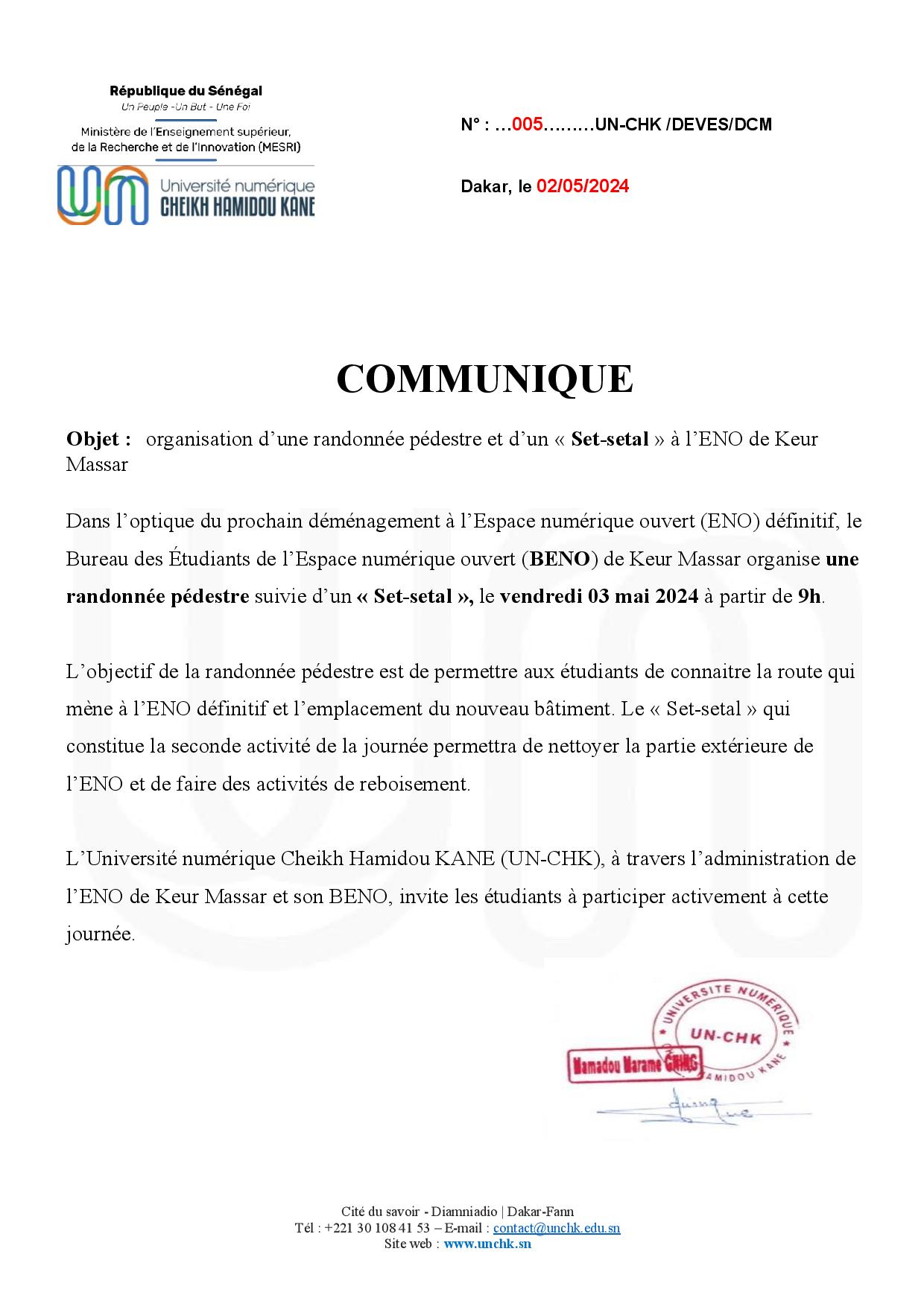 Accueil > communiqué > Organisation d’une randonnée pédestre et d’un « Set-setal » à l’ENO de Keur Massar