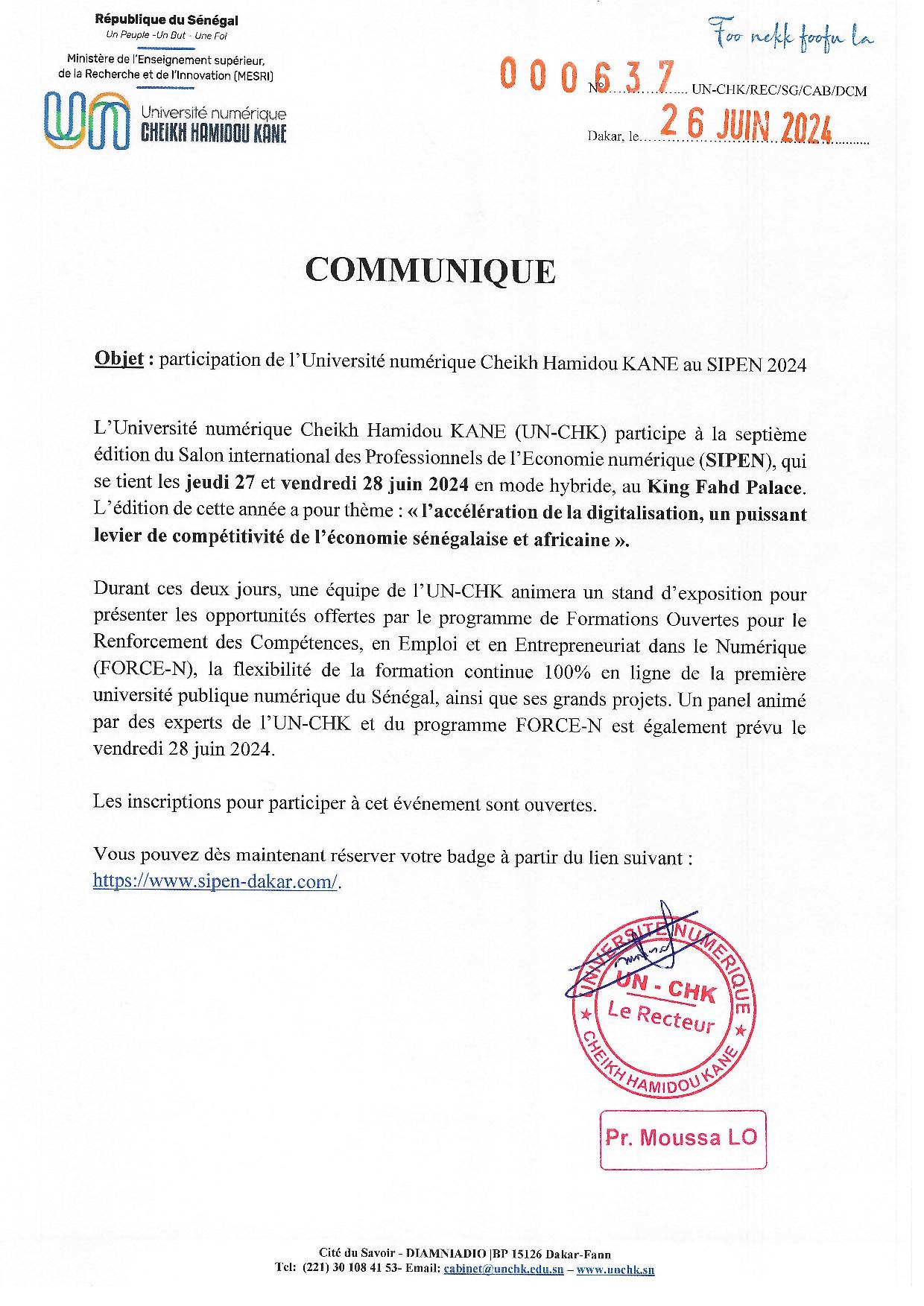 Accueil > communiqué > participation de l’Université numérique Cheikh Hamidou KANE au SIPEN 2024