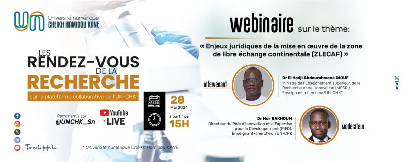 Le webinaire « Rendez-vous de la Recherche » (RVR) du mois de mai 2024, organisé par le Pôle d’Innovation et d’Expertise pour le Développement (PIED), a été consacré à la Zone de Libre-Échange Continentale Africaine (ZLECAF). Animé par Dr El Hadji Abdourahmane DIOUF, Ministre de l’Enseignement supérieur, de la Recherche et de l’Innovation (MESRI) et enseignant-chercheur à l’UN-CHK, cet événement a mis en lumière les enjeux juridiques cruciaux liés à la mise en œuvre de la ZLECAF. La modération a été assurée par Dr Mor BAKHOUM, Directeur du Pôle d’innovation et d’Expertise pour le Développement (PIED) et enseignant-chercheur à l’UN-CHK.